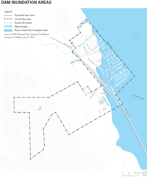 Yountville is subject to flooding resulting from a potential failure of Rector Creek Dam. The earthen embarkment dam, built in 1946, stores about 4,600 acre-fee of water and the crest height is 164 feet. Earthquakes centered close to a dam are typically the most likely cause for failure.