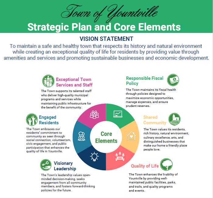 The Town of Yountville's Strategic Plan and Core Elements provides a vision for the town's development, outlining key objectives and initiatives designed to enhance the community's vitality, sustainability, and overall well-being. With a focus on strategic priorities, this plan serves as a guiding beacon for informed decision-making, steering the Town Council in shaping the future of Yountville over the designated period.
